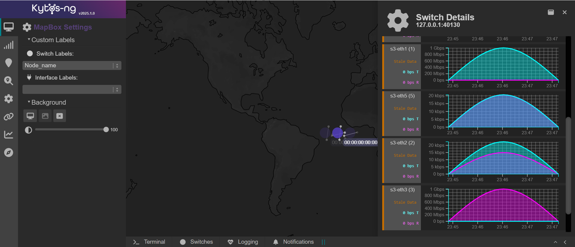kytos_stats interface utilization charts have been fixed on the switch details panel as shown on Figure 1. If kytos_stats is enabled, interface utilization charts will be plotted, the current polling interval is 60 seconds. These charts are meant to provide a quick overview about network traffic utilization on interfaces of a switch.